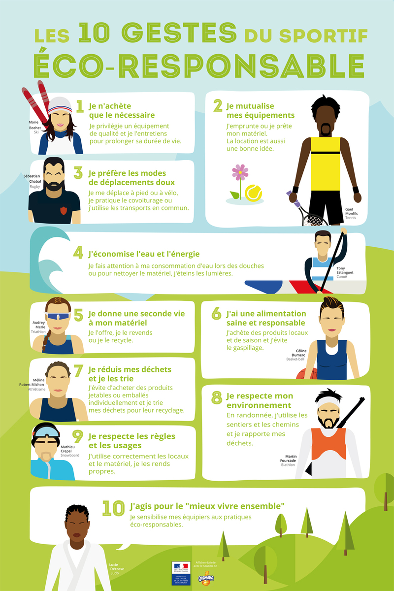 Ayez les bons réflexes à adopter pour pratiquer du sport tout en préservant l’environnement et limitant son impact sur la planète, il suffit d'adopter quelques gestes simples mais efficaces que nous vous invitons à suivre via le visuel suivant :